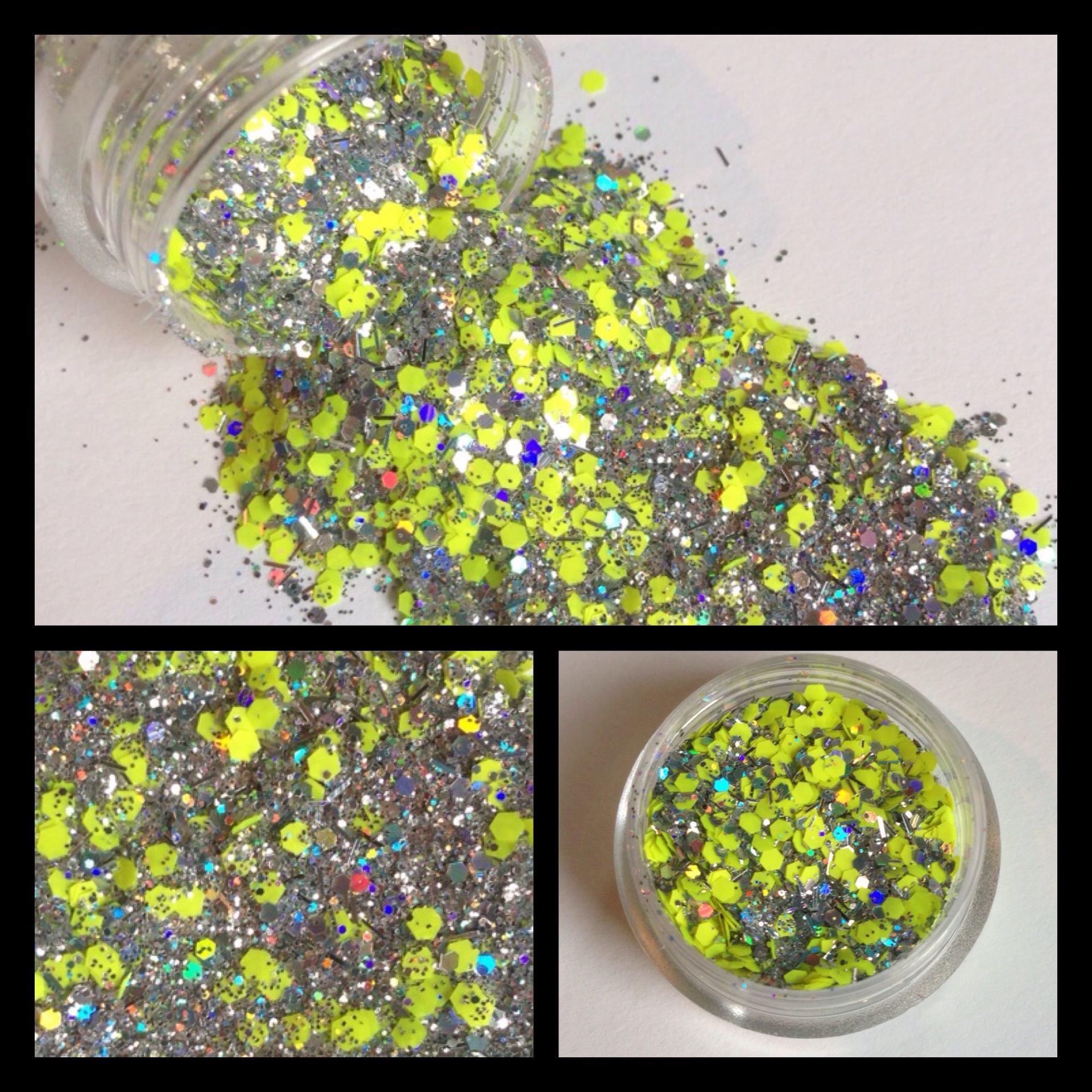 This is beautiful Holographic Silver base mixed with Matte Yellow Hexagon Glitter. This can be mixed with Acrylic, Gel and nochip polish.