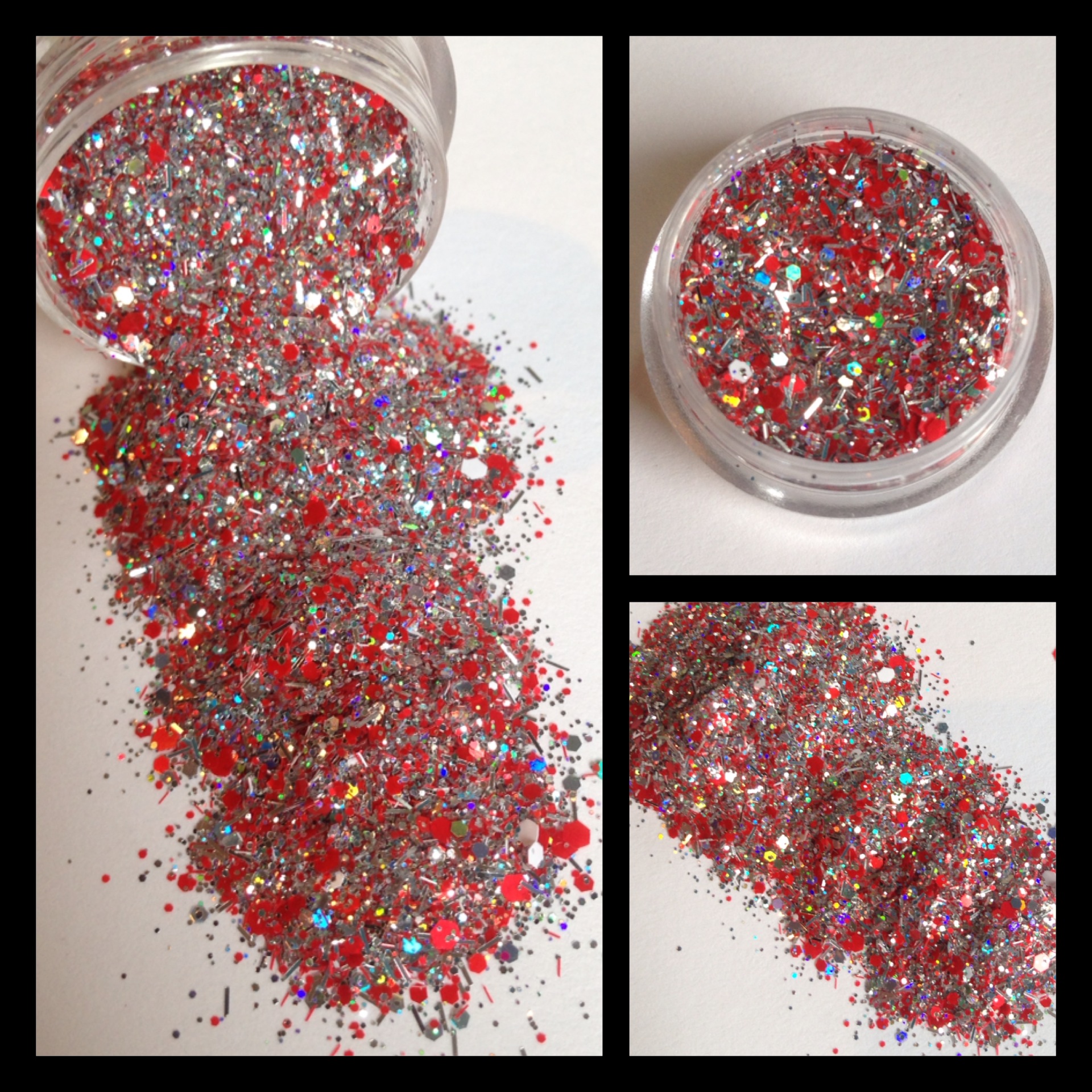This is beautiful Holographic Silver base mixed with Matte Red Hexagon Glitter. This can be mixed with Acrylic, Gel and nochip polish.
