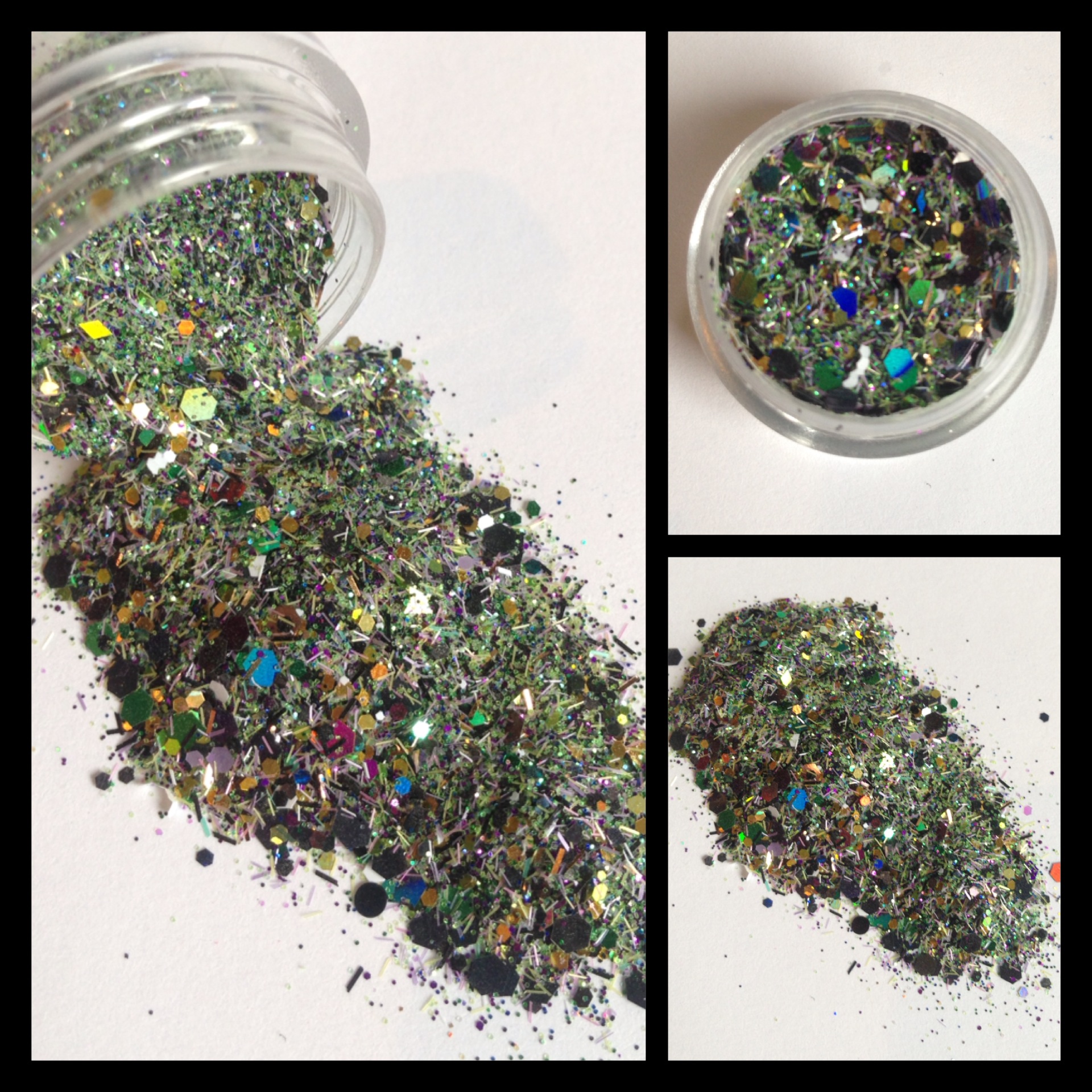 Beautiful green,black,gold and iridescent sparkling Christmas mix. This mix consist of a variety of tinsel glitters, hexagon in different sizes, fine holographic glitter.