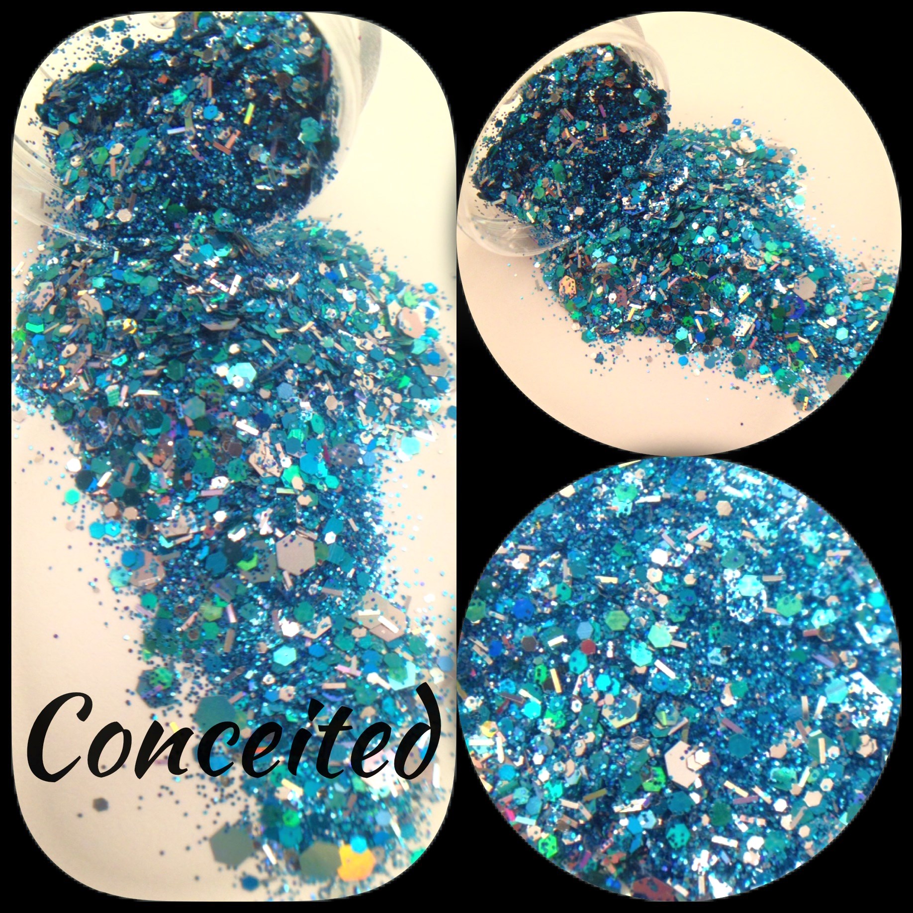 This is a beautiful blue holographic mix. This mix consist of a variety of blue glitters, different size blue and silver holographic hexagons and silver tinsel. It can be used in acrylic or gel nails.