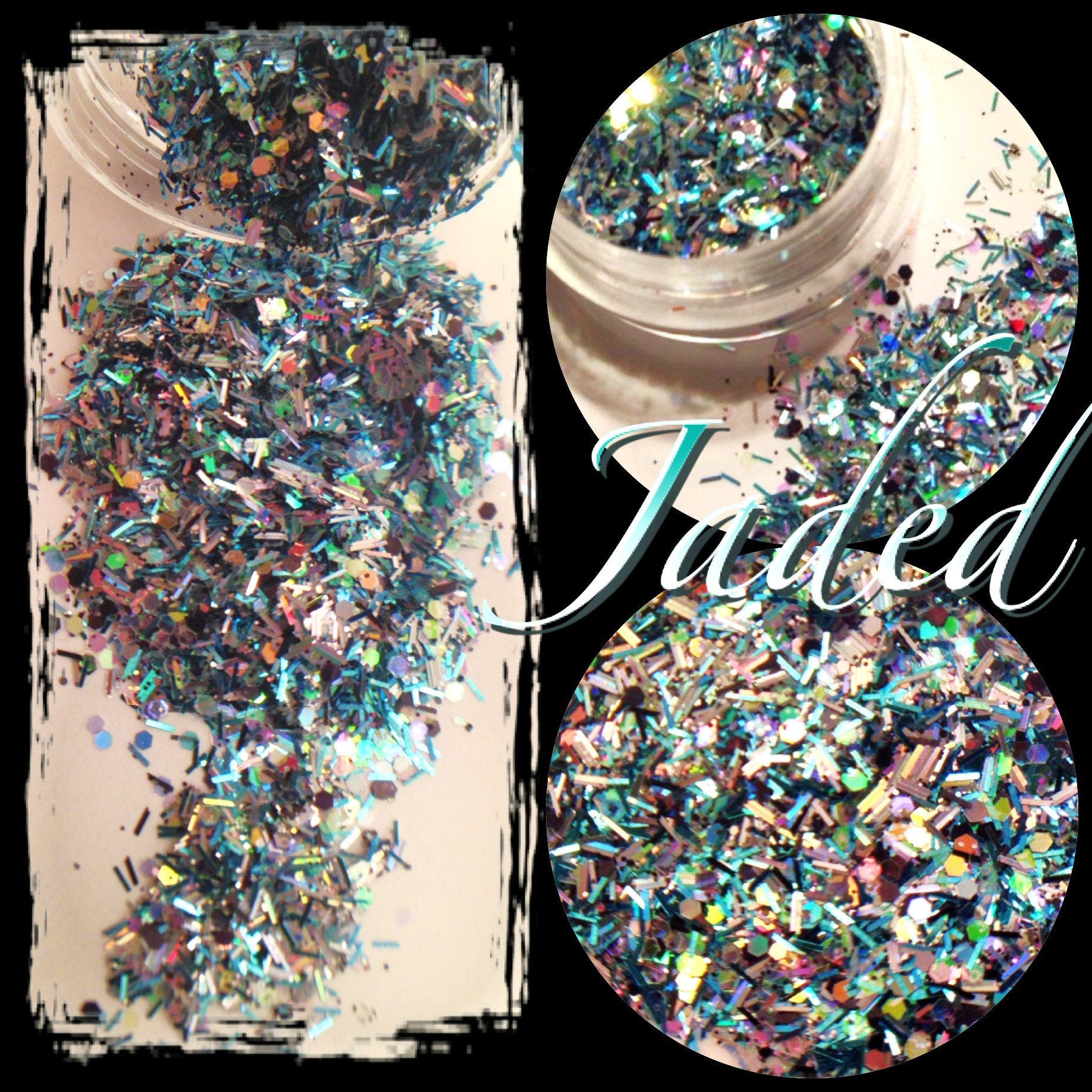 This is a beautiful holographic mix. This mix consist of a variety of blue, silver,and cooper holographic tinsel, and silver hexagon. It can be used in acrylic or gel nails.