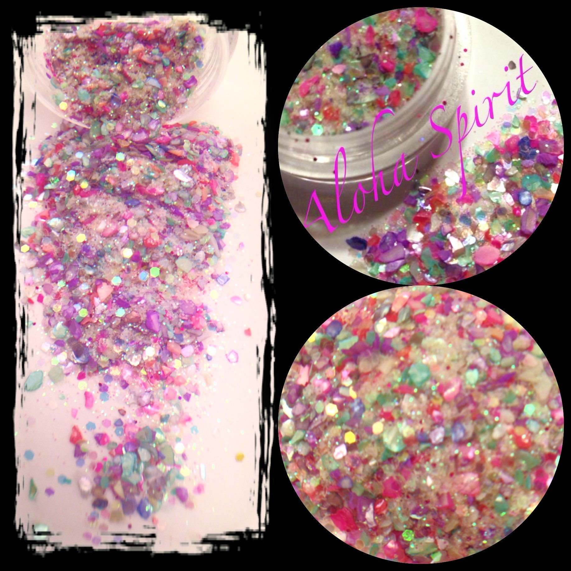 This is a beautiful crushed shell mix. This mix consist of a iridescent light pink mix, aqua blue, pink, and purple crushed shells. It can be used in acrylic or gel nails.