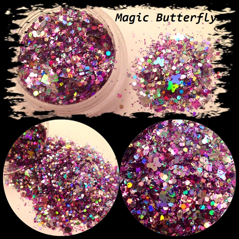 This is a beautiful purple glitter mix. This mix consist of purple holographic glitter, silver hexagons, purple diamonds, squares, iridescent squares and silver holographic butterflies. It can be used in acrylic or gel nails.