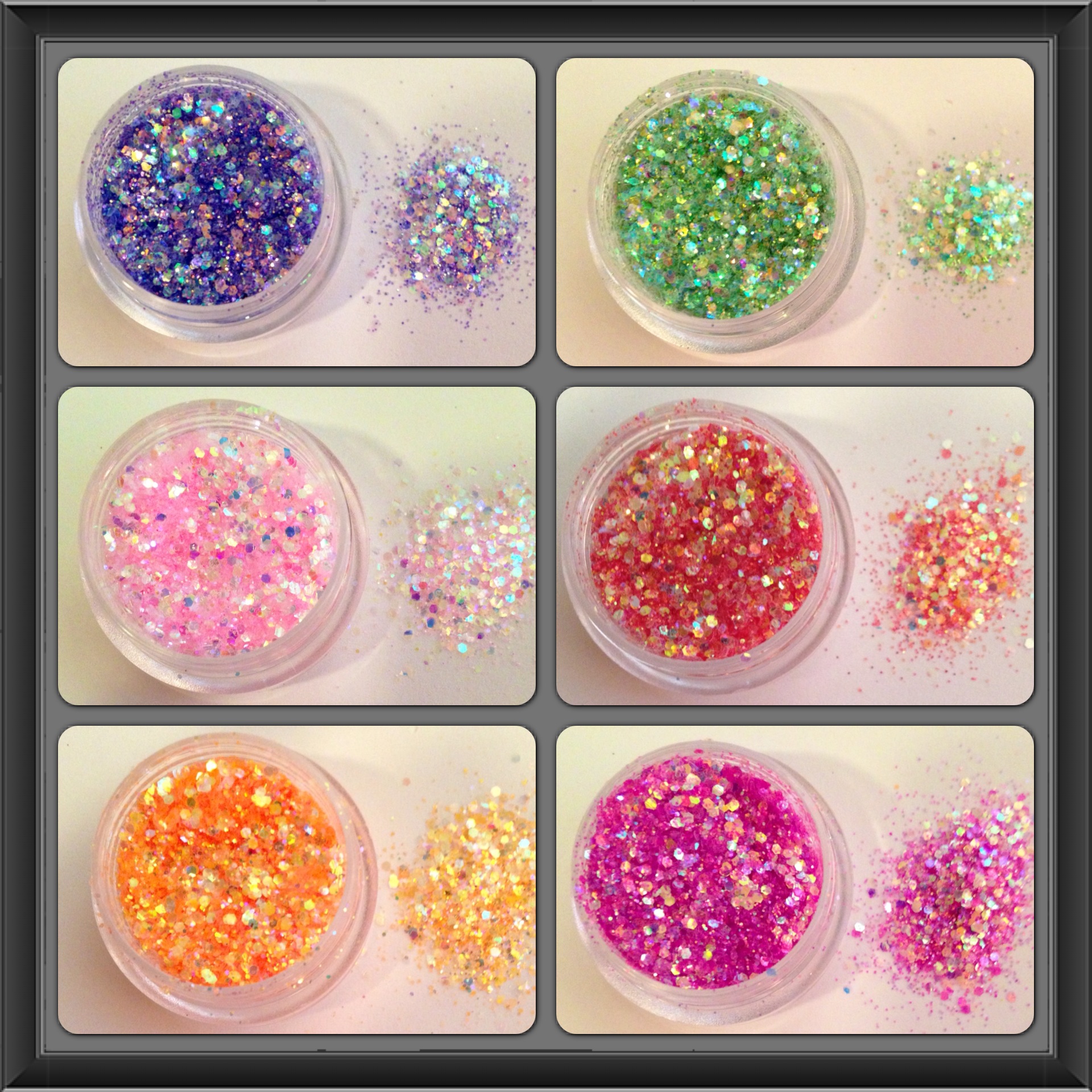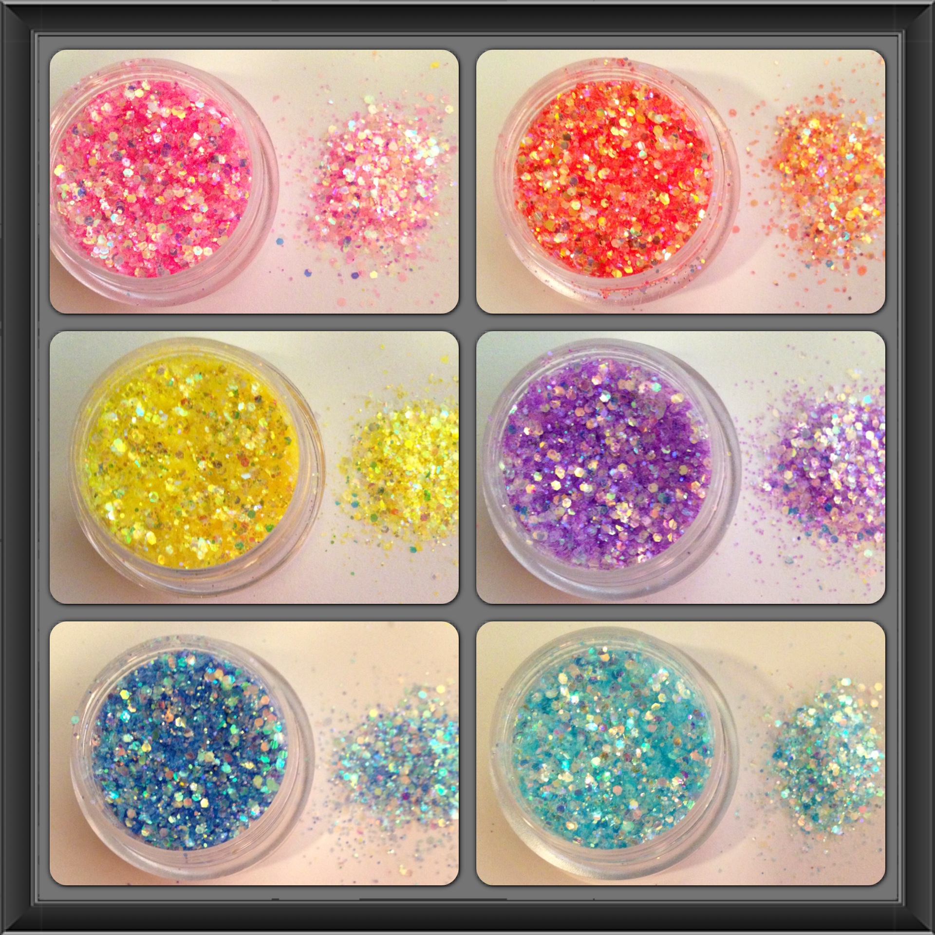 This collection offers 12 different beautiful bright colors. These glitters are mixed with the Crystal Hexagon Glitter to give it an extra bling.