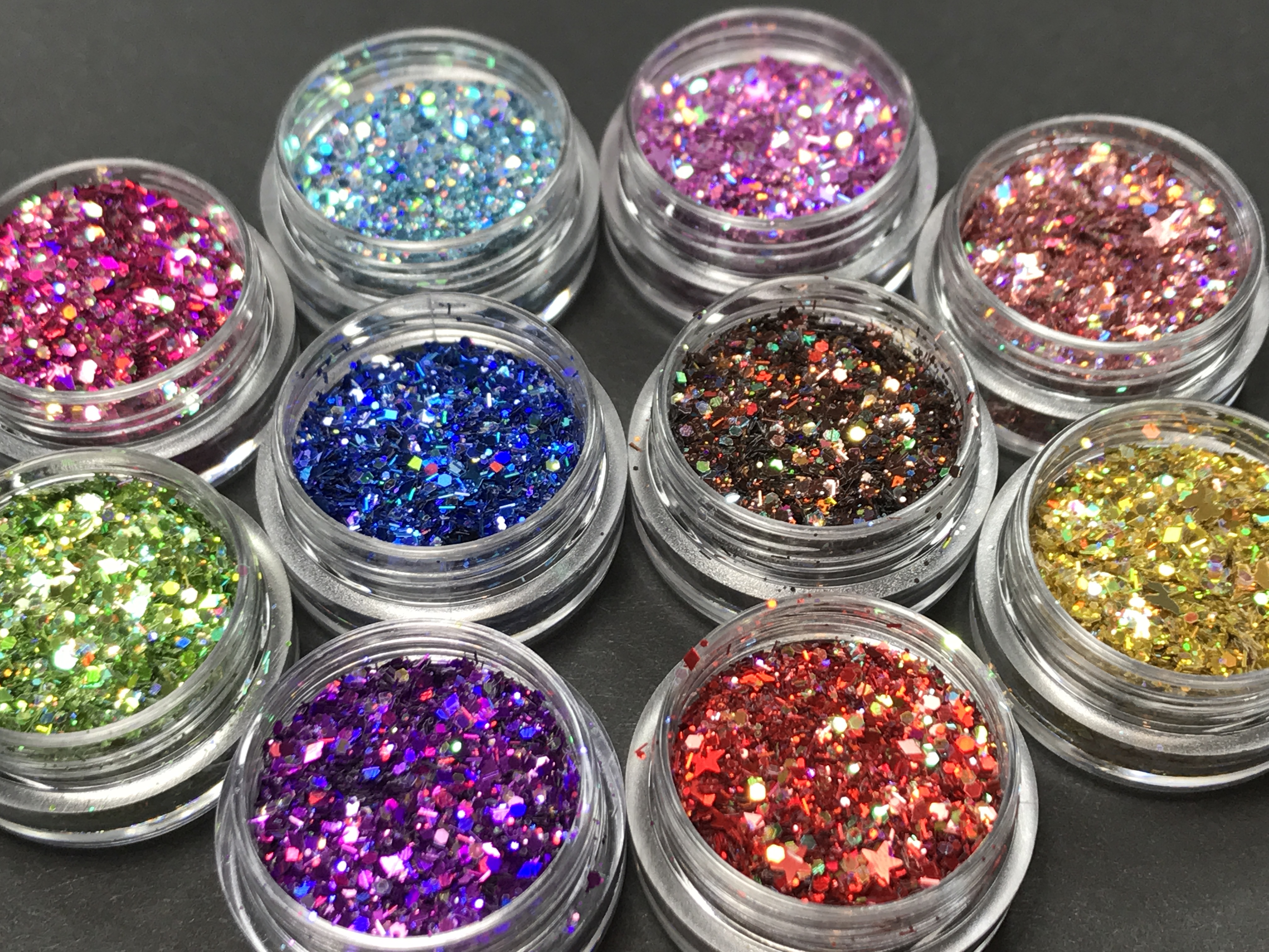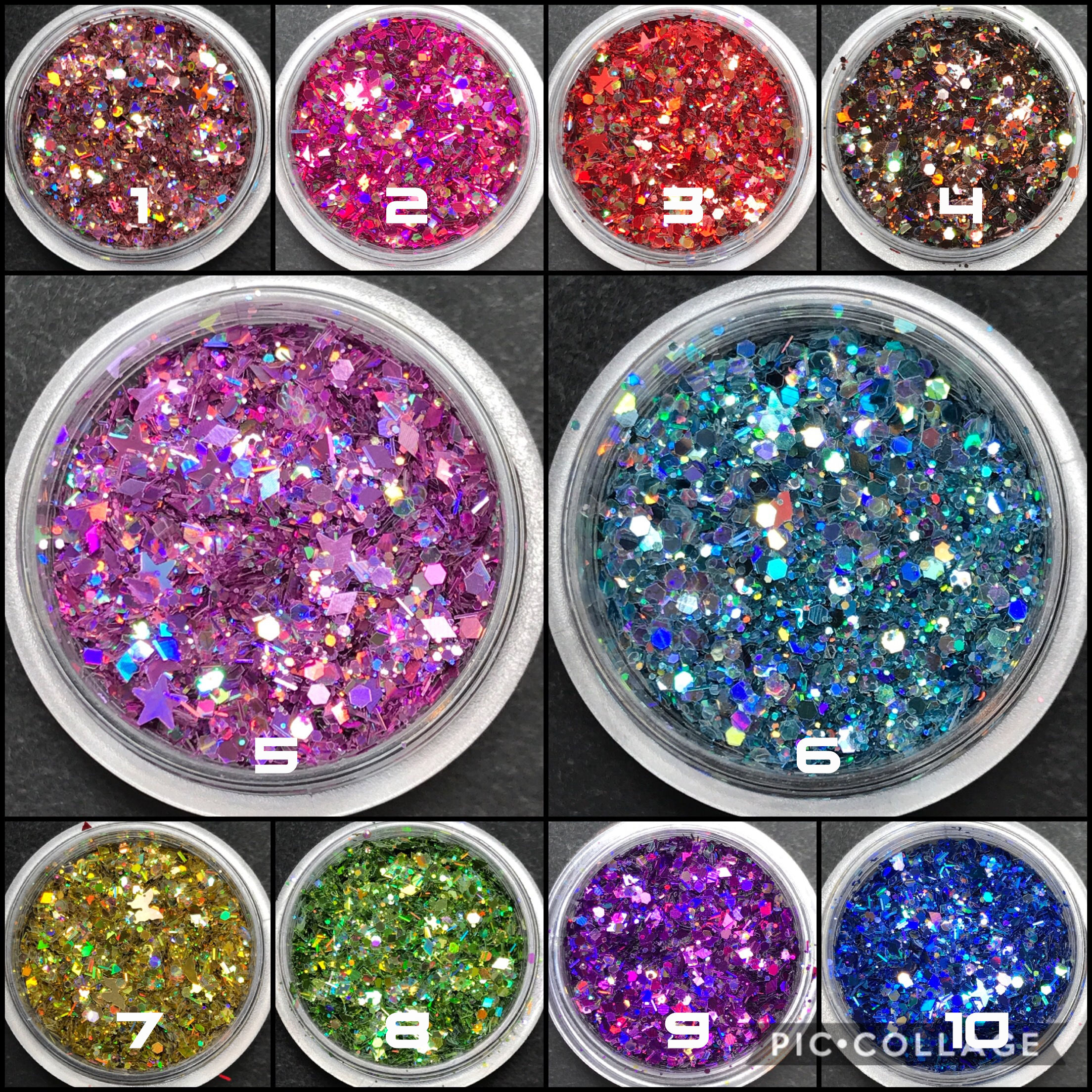 Beautiful and sparkling Holographic mix. This mix consist of a variety of glitters like big and small diamond, tinsel, hexagon in different sizes, fine holographic glitter.