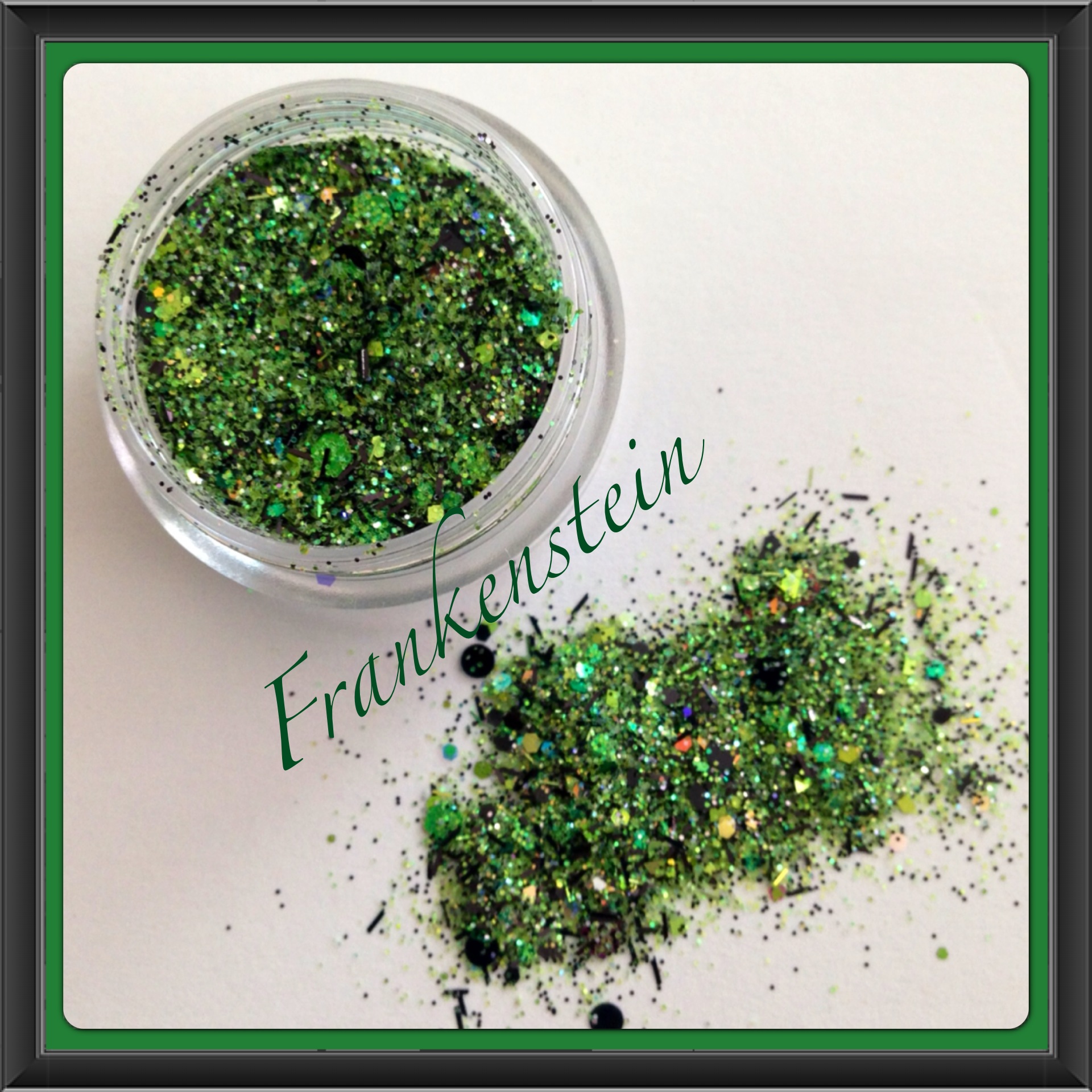 This is a green and gold glitter mix made with black hexagon,circles and tinsel. This is perfect for Halloween.