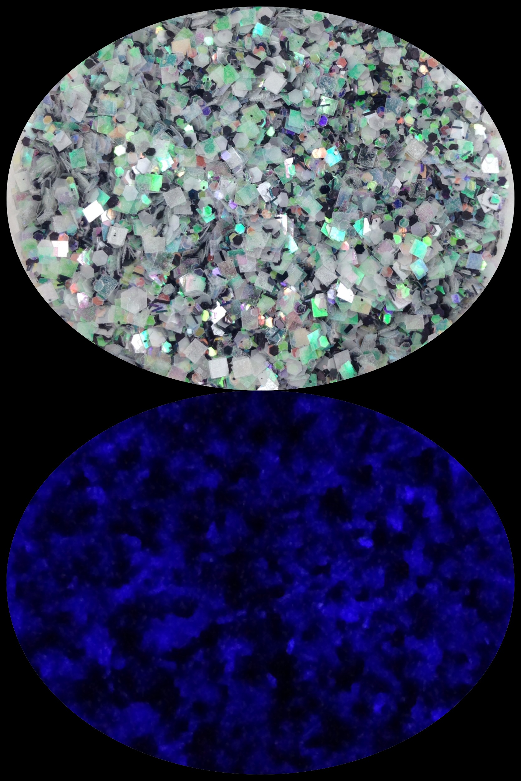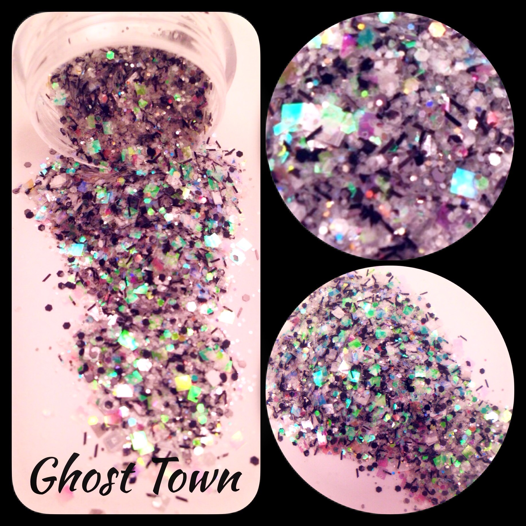 This is another one of my Halloween Mixes. This mix was made with white iridescent base fine glitter,iridescent squares, iridescent and black hexagons and tinsel.