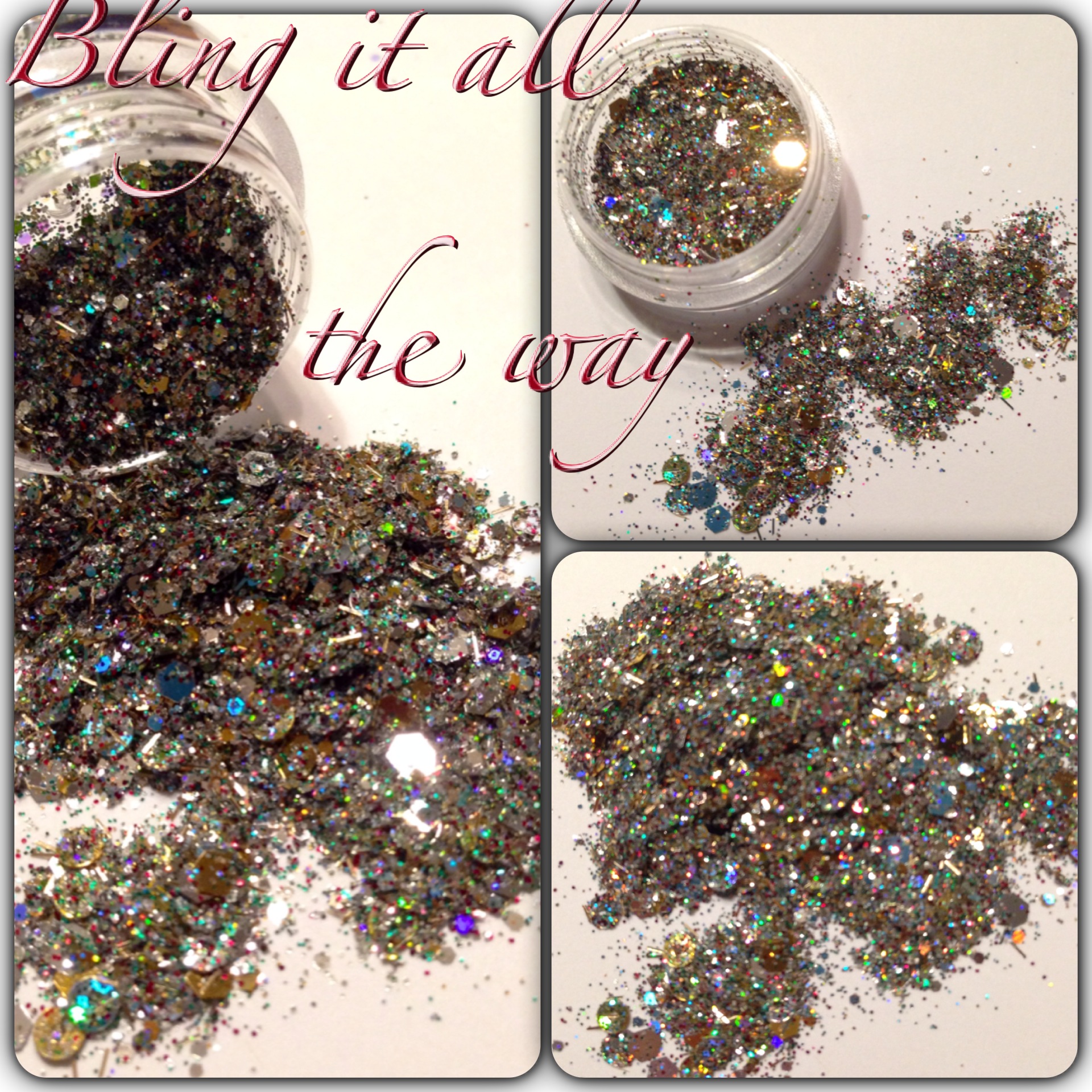 Beautiful and gold,silver and blue sparkling Christmas mix. This mix consist of a variety of tinsel glitters, hexagon in different sizes, fine holographic glitter.